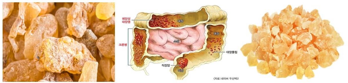2007년에 발표된 논문에 따르면, 인체적용시험에서 보스웰리아를 6주 동안 하루 300 mg씩 3번 섭취했을 때 궤양성 대장염 개선에 도움을 줄 수 있다는 결과를 보고하고 있습니다.