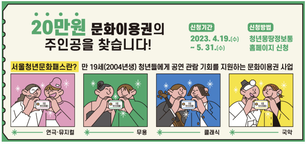 청년몽땅정보통,서울청년문화패스 사업이란? 서울청년문화패스는 사회에 첫 발을 내딛는 만 19세 청년들에게 연극, 뮤지컬, 무용, 클래식, 전통예술 등 문화예술 공연 관람 기회를 제공하고 문