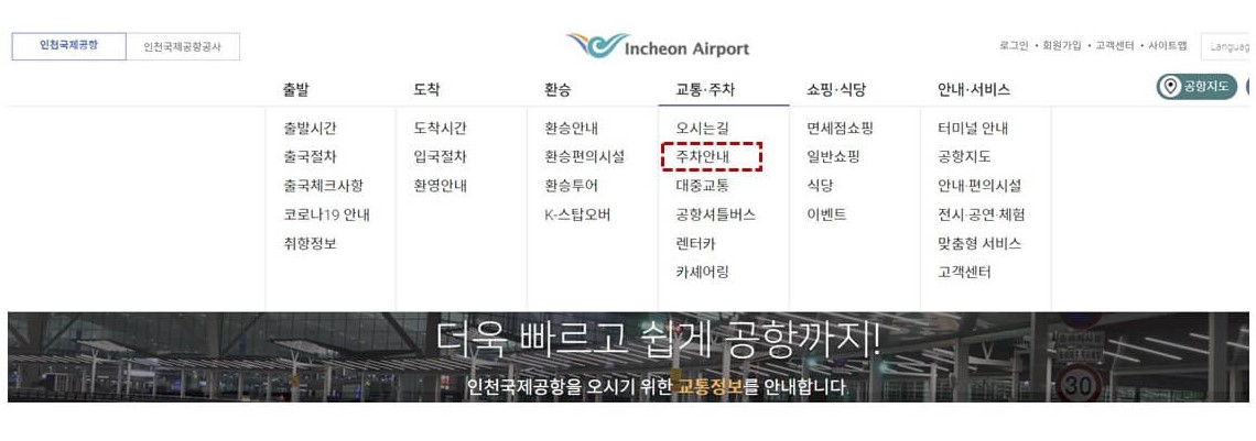 1. 검색창에 '인천국제공항' 로 검색하여 '교통/주차'를 클릭하여 접속 후, '주차안내'를 클릭합니다.