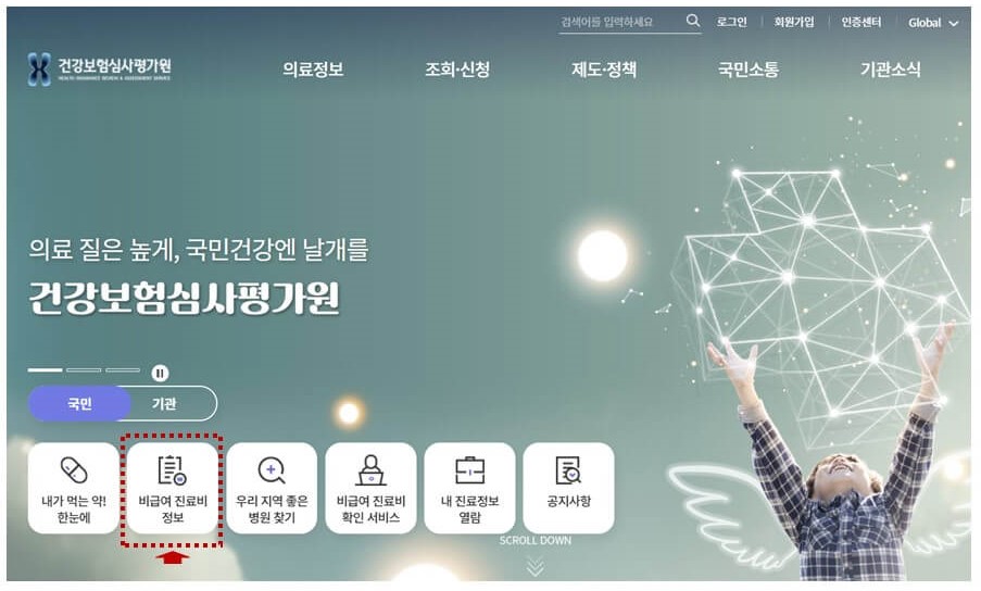 1) 먼저 '건강보험 심사평가원'을 검색하여 접속합니다. 홈페이지 하단 '비급여 진료비 정보' 메뉴를 클릭합니다.