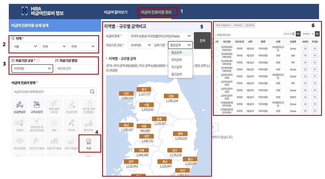2) 아래 보이는 화면에서 번호 순서대로 지역 선택하시고, 의료기관 규모 선택 후 비급여 진료비 항목에서 '치과'를 선택합니다. '임플란트' 체크하고 검색을 누르면 지역별 병원별로 아래와 같이 임플란트 진료비용이 나오게 됩니다.