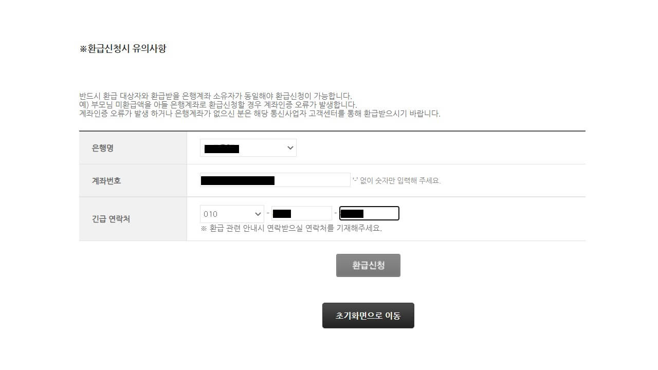 6. 아래 화면처럼 은행명과 계좌번호, 핸드폰 번호를 입력하면 '환급신청'이 완료됩니다.