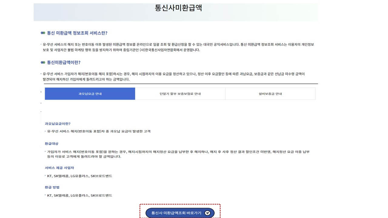 2. 통신사미환급액에서 가장 아래부분에 '통신사 미환급액조회 바로가기'를 클릭합니다.