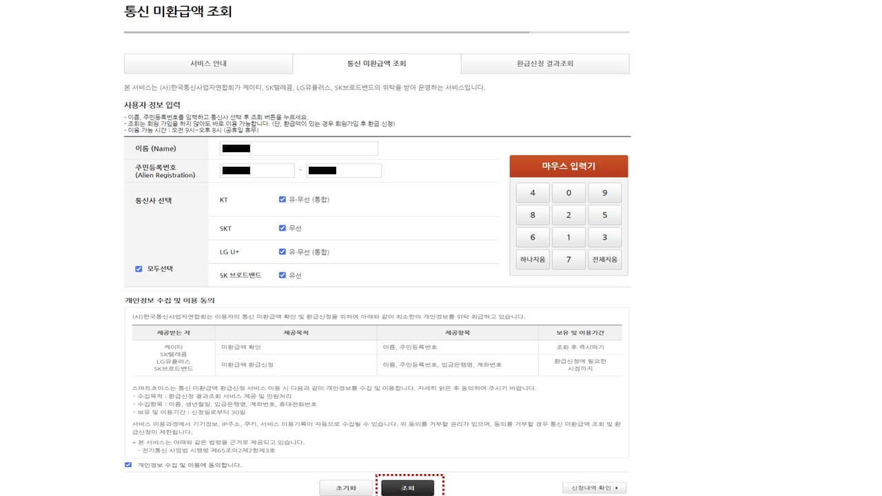 3. 통신 미환급액 조회에서 이름과 주민등록번호를 기입하고, 통신사 선택에서 '모두 선택'을 설정 후 조회합니다.
