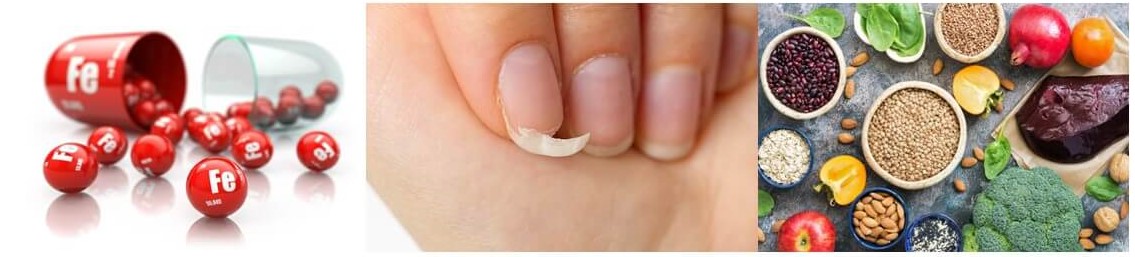 철분 부족으로 인해 쉽체 부서지는 손톱 몸에 철분이 부족하면 손톱이 얇아지고 쉽게 부러지며 바깥쪽이 구부러져 올라가 숟가락 같은 모양이 만들어질 수 있습니다. 채식주의나 생리 출혈이 심한 여성들은 철분 결핍의 위험이 크지만, 남성들은 철분 과다 섭취를 할 가능성이 더 높습니다. 폐경 전 여성은 하루 18 mg, 폐경 후 여성은 8 mg의 철분이 필요합니다.