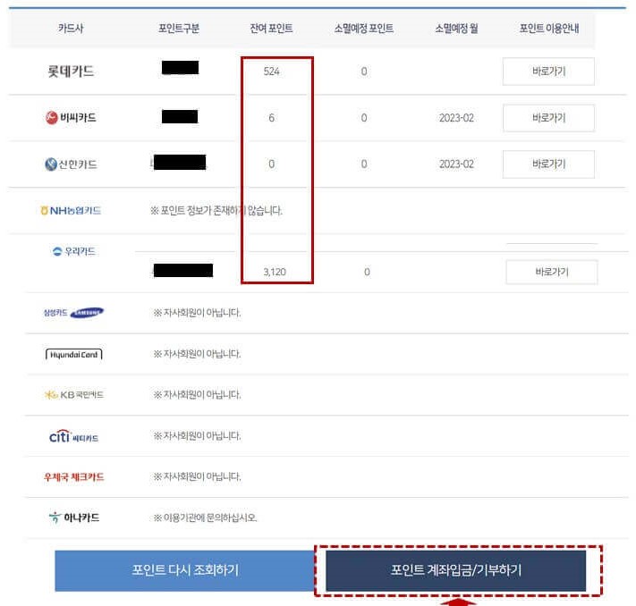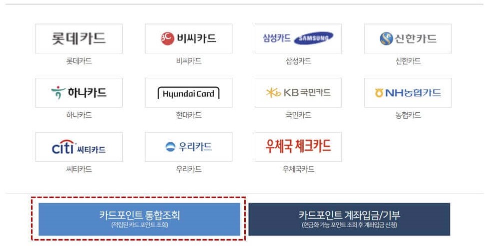 접속하여 '카드 포인트 통합조회&계좌입금'을 클릭합니다.
