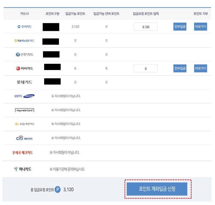 아래 '포인트 계좌입금/기부하기'를 클릭하고 현금화하고 싶다면 '전부입금'을 클릭하면 포인트가 입력됩니다.
