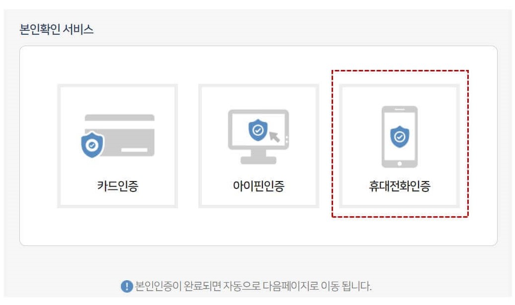 4. 개인정보 수집 및 이용 등에 대한 동의에서 '전체 동의'로 클릭 후 다음 단계인 본인 확인 서비스에서 저는 휴대전화 인증으로 하였습니다.